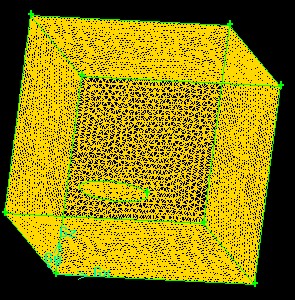 模型如下图所示:正方体内有一圆面,用整个体split该圆面,将圆面的边界条件定义为fan。圆面上的网格大小为0.1m,正方体的网格采用正四面体,大小也为0.1m。
