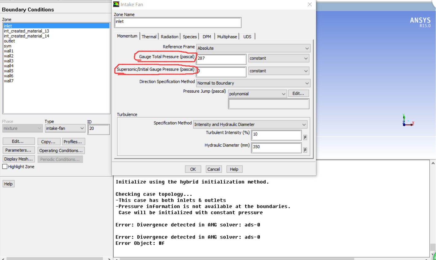 求大神指导,如图一所示,出口边界怎样设置在网格内部,外部是自由流通区域?图二的压力入口压力出口怎样设置?比如说入口压力287pa,速度4.5m/s,空气流的话怎样设置参数才不会出现如图二所示的错误?拜托大家指点指点.