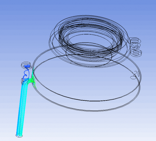 用CFX分析的,进出口设置后,结果是这样,不能看到出口有流体,是否哪里设置有问题,进口3mm,出口是0.1mm,设置为气体,帮忙指教下,谢谢