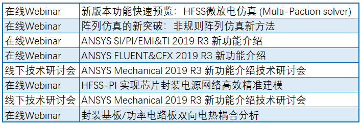除了此次ANSYS 2019 R3新版本发布,ANSYS中国还将举办多场ANSYS产品应用及实践相关的线上及线下研讨会,敬请各位关注ANSYS中国微信公众号,及时获取报名信息。想要了解更多关于ANSYS 2019 R3的亮点细节及相关网络培训,请点击下方“阅读原文”获取。 2019年版本一览