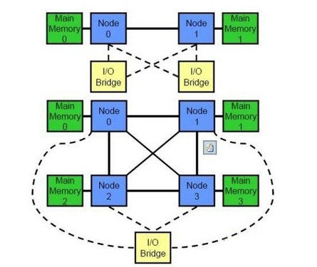 在Nehalem之前,Intel一直使用FSB前端总线作为处理器与芯片组连接的桥梁,虽然1600Mhz的前端总线对于桌面级数据处理来说已是绰绰有余,但对于数据量庞大的服务器来说,其仍然是性能的瓶颈。Nehalem因此引入了全新的串行总线QPI,QPI总线是基于数据包传输(packet-based)。其拥有高带宽、低延迟的点到点互连技术等特点,它的传输速度可以达到每秒6.4G次数据。与FSB最大的不同在于,QPI不仅仅可以负责CPU与北桥通信,还可以实现CPU与CPU之间的相互连通。正如前文中所提到的Nehalem模块化的特点,对于不同市场的Nehalem,可以具有不同的QPI总线条数。比如桌面市场的CPU,具有1条或者半条QPI总线(半条可能是用10bit位宽或单向);DP服务器(双CPU插座)的CPU,每个具有2条QPI总线;而MP服务器(4个或8个CPU插座)的,则每个具有4条或更多的QPI总线。