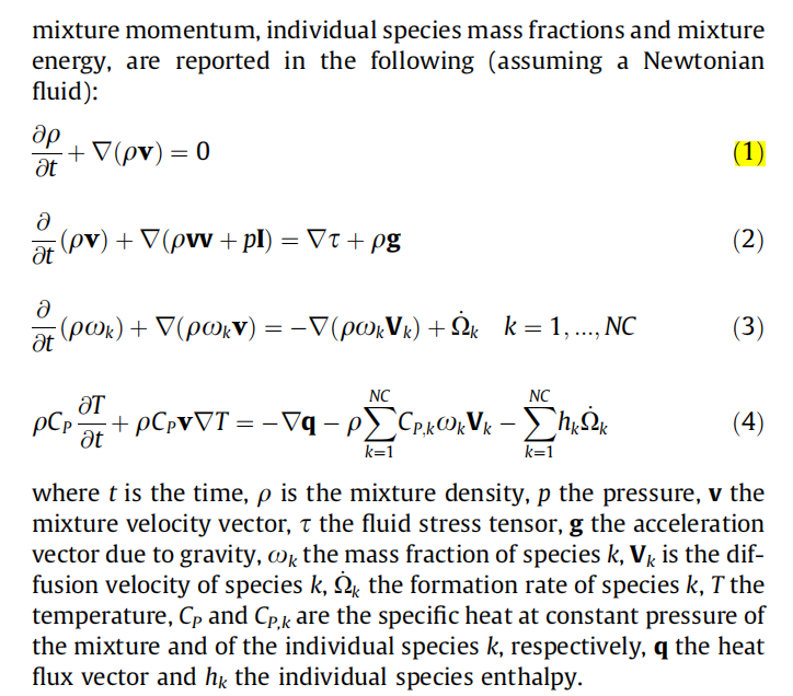 图片来自cuoci等人2013年发表的《A computational tool for the detailed kinetic modeling of laminar flames: Application to C2H4/CH4 coflow flames》论文中关于基本控制方程中的描述。